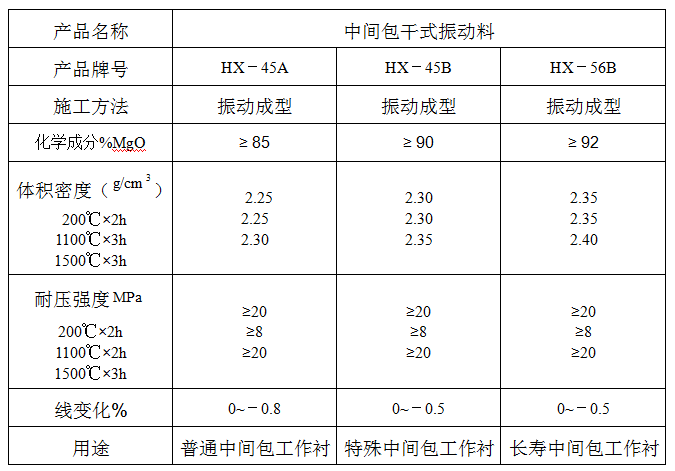 应用方法:清除中间包久衬上的残钢残渣,先用干式料铺平中间包底部所要求的厚度,座胎具,加入干式料振动成型后加热到200℃~300℃保温2~3小时后,脱胎待用即可。